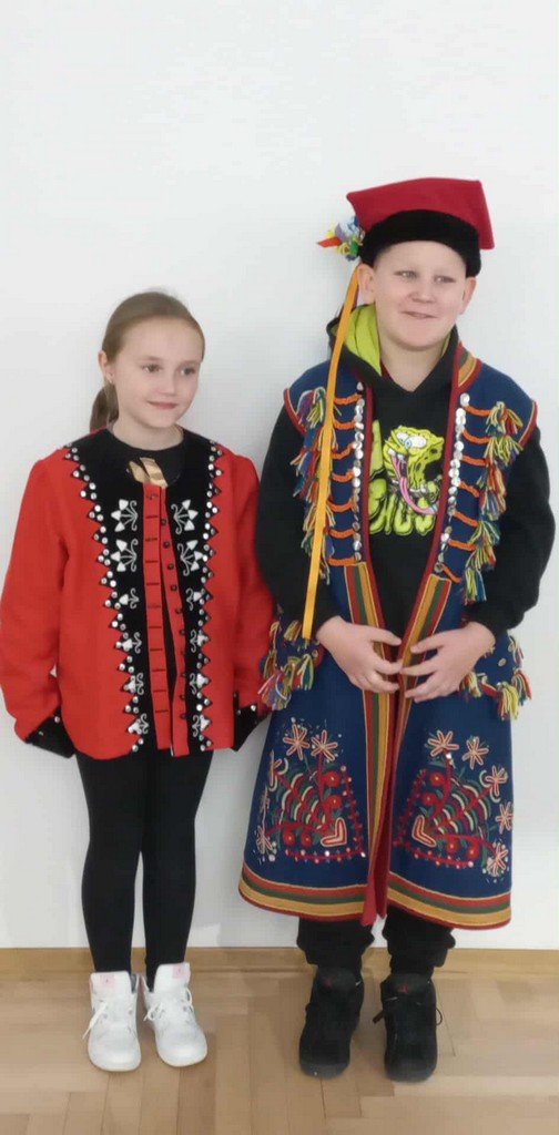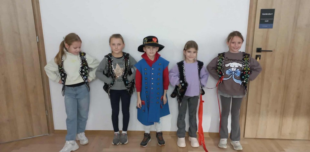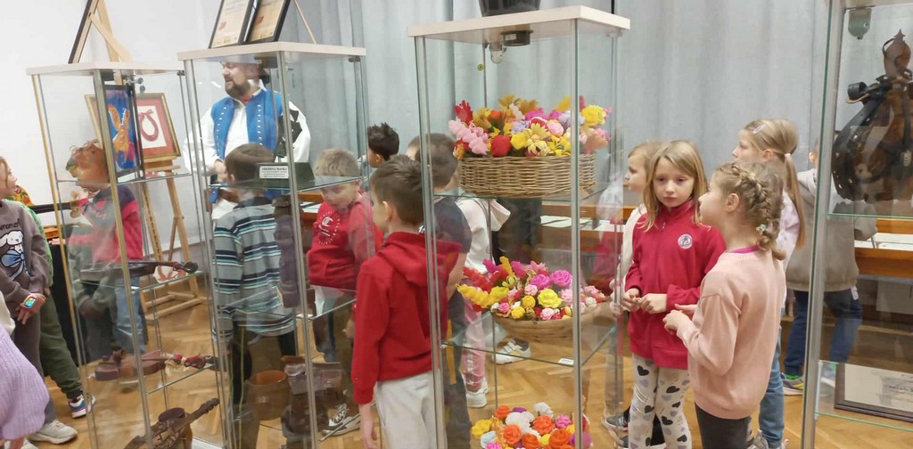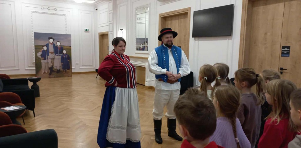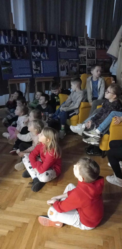 Tradycje Pogórzan związane z obrzędowością, rękodziełem oraz strojami ludowymi dzieci mogły obejrzeć w dwóch salach wystawienniczych. Tu dużym zainteresowaniem cieszyły się instrumenty, ozdoby z papieru oraz szopki. Okazało się, że dawna tradycja kolędowania jest bardzo mało znana, tym większym więc zaciekawieniem cieszyły się przebrania kolędników. Film o zespole przybliżył 60 lat prób, występów, repertuaru oraz nagród i sukcesów. W garderobie każdy mógł obejrzeć i przymierzyć stroje regionalne zarówno pogórzańskie, jak i lubelskie, czy rzeszowskie i dowiedzieć się jak się nazywają. Dziękujemy Gorlickiemu Centrum Kultury za tak ciekawe zajęcia, które przybliżyły dzieciom tradycje i kulturę naszej małej ojczyzny. Zachęcamy do obejrzenia relacji z wizyty dzieci na stronie GCK na Facebooku.