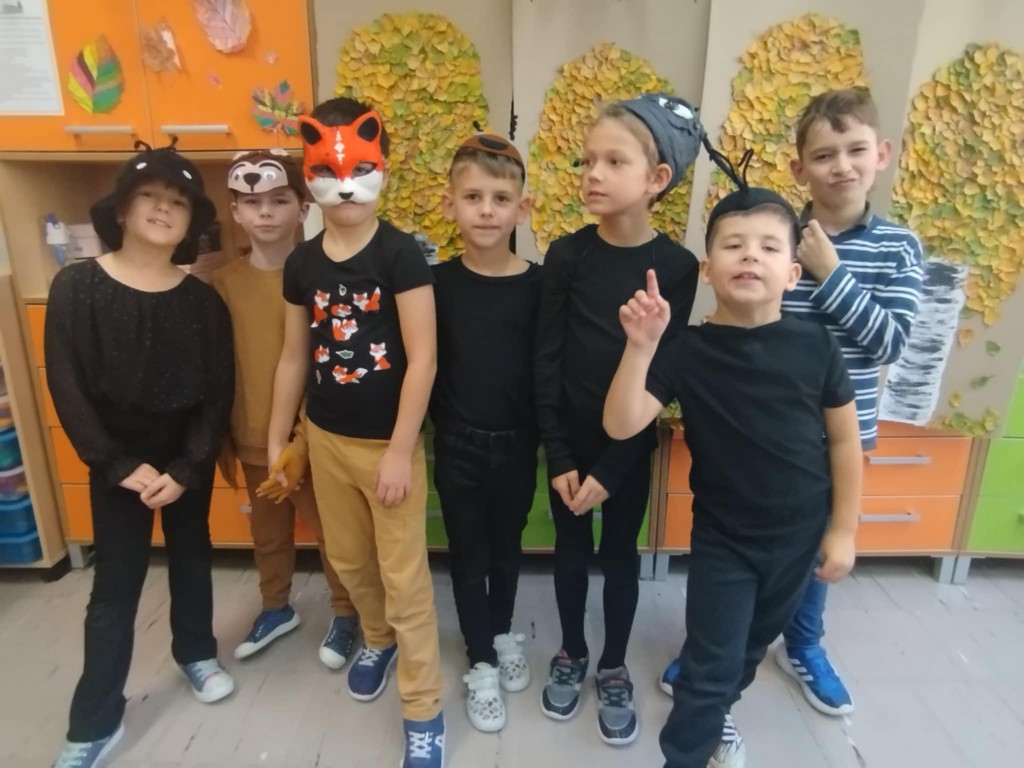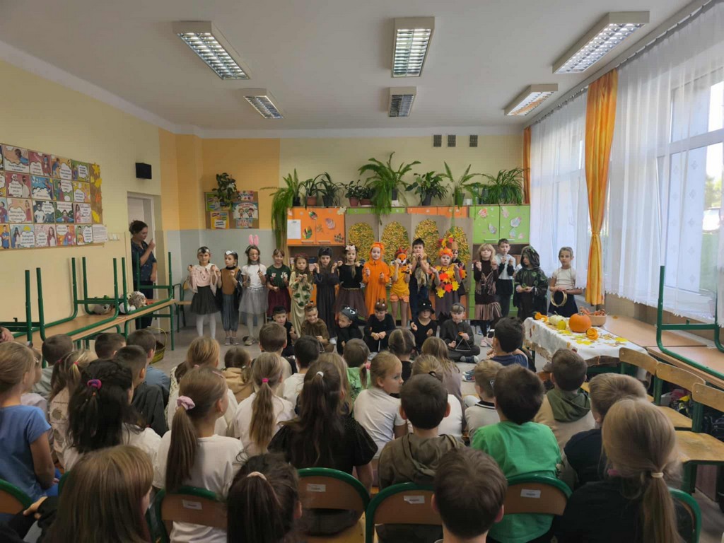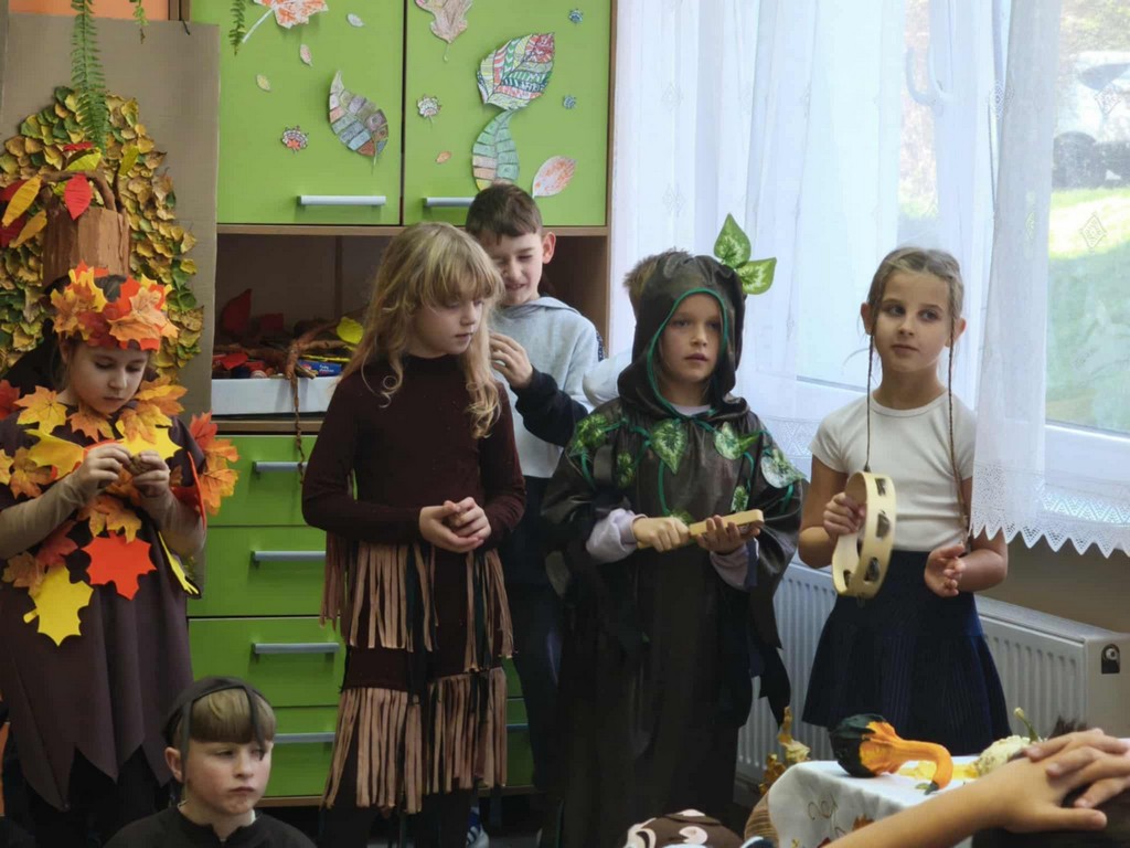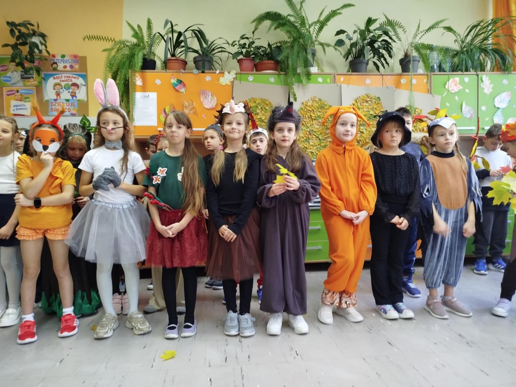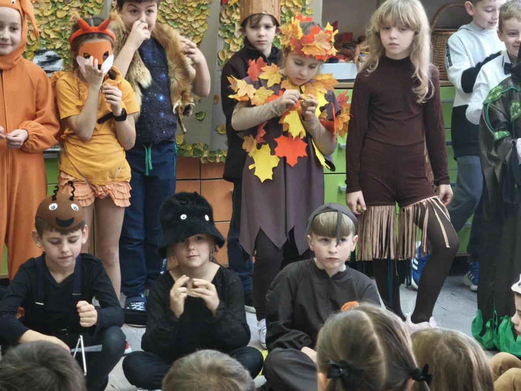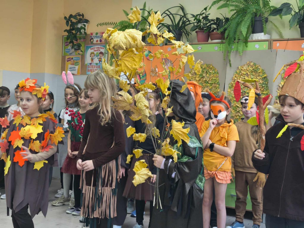 Barwna inscenizacja wprowadziła wszystkich w nastrój złotej polskiej jesieni. Na scenie pojawiły się postacie roślin i zwierząt kojarzące się z tą porą roku, tj. „ łysiejące” drzewa, jarzębina i głóg, czy odlatujące do ciepłych krajów bocian i jaskółka. Wiewiórki, zając i mrówki gromadziły zapasy a borsuk, jeże i niedźwiedź przygotowywały się do zimowego snu. Była też muzyka i tańce, jak na prawdziwym balu. Dzieci z zachwytem śledziły występ, podziwiając przepiękne stroje, przygotowane przez rodziców, dekorację, jaka powstała w szkolnej świetlicy dzięki zaangażowaniu pani Judyty Kiełtyki oraz pełną radości grę aktorską, nagrodzoną na koniec gromkimi brawami. „Bal jesieni” okazał się nie tylko świetną zabawą, ale także doskonałą okazją do rozwijania talentów scenicznych i integracji uczniów młodszych klas.